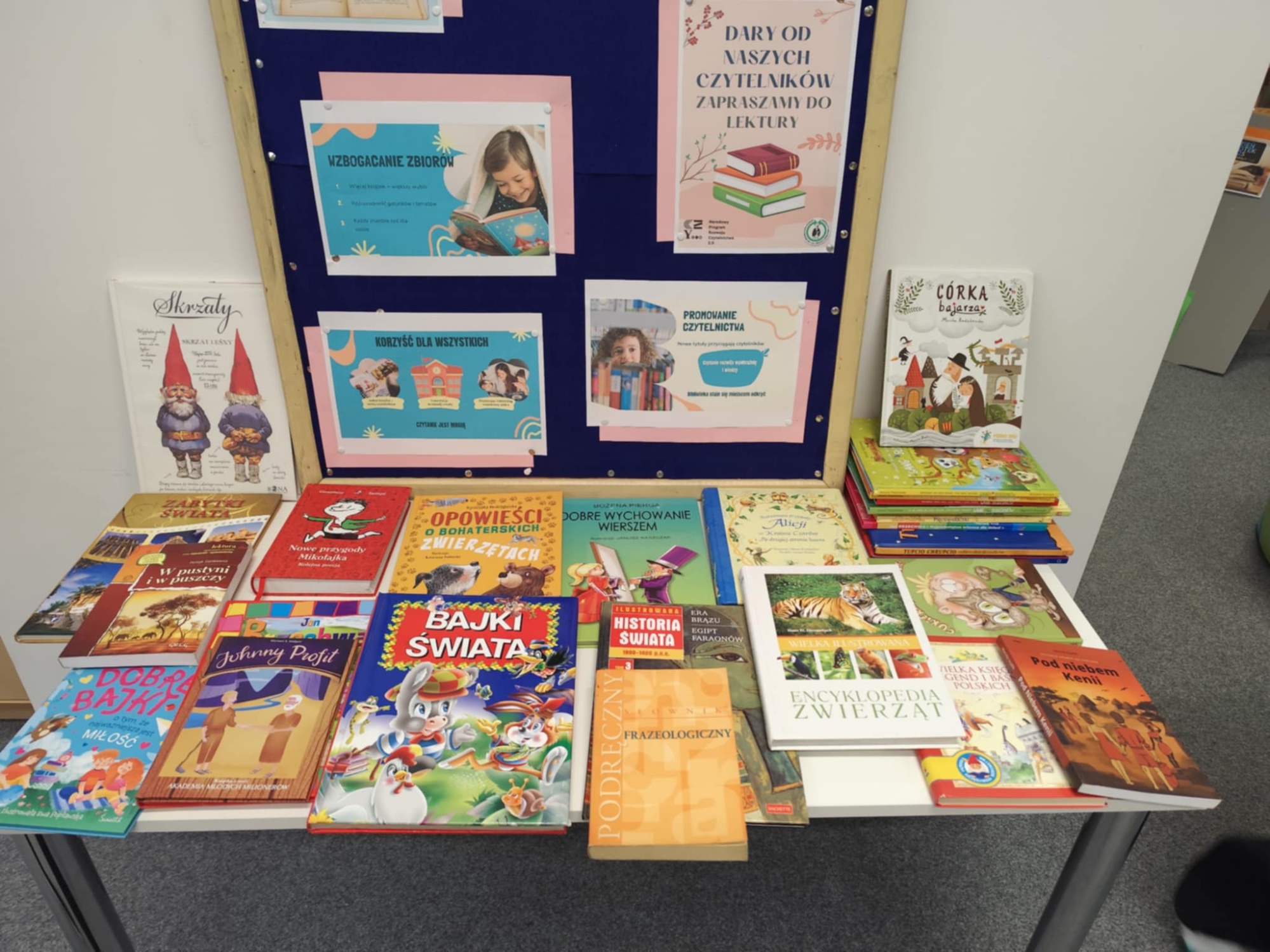 Z radością informujemy, że biblioteka szkolna wzbogaciła się o kolejne pozycje książkowe dzięki darom przekazanym przez uczniów, rodziców i przyjaciół szkoły. Podarowane tytuły zasilą księgozbiór i będą służyć wszystkim czytelnikom – zarówno w rozwijaniu zainteresowań, jak i w poszukiwaniu inspiracji do nauki i zabawy.