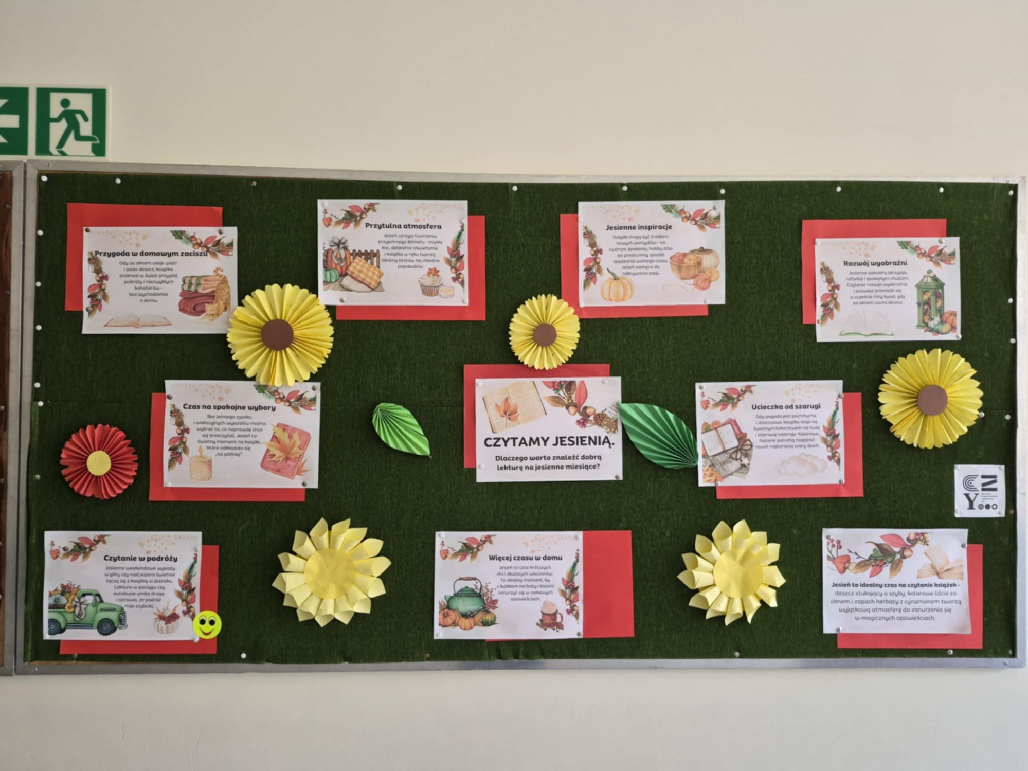 Jesień to idealny czas, by sięgnąć po ciekawą książkę i zanurzyć się w magiczny świat literatury. W szkolnej bibliotece przygotowano jesienną wystawę „Czytamy jesienią”, która zachęca uczniów do spędzania chłodniejszych dni z książką w ręku. Na gazetce można znaleźć inspirujące hasła, które pokazują, że czytanie to doskonały sposób na relaks, rozwijanie wyobraźni czy odkrywanie nowych pasji.